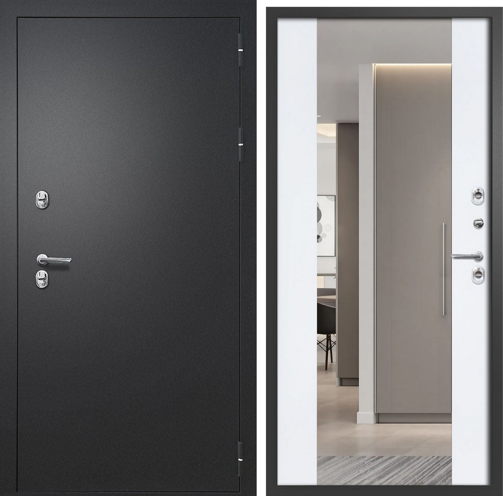 FD Айварс ТЕРМО Зеркало дверь с терморазрывом Velluto Bianco / Букле черный Толщина полотна / глубина короба - 110/147 мм Толщина металла - полотно / короб - 1,4 мм Внутренняя отделка: МДФ-панель 16 мм , ЗЕРКАЛО Наполнение - пенополистирол Уплотнение - 3 контура (2 полотоно /1 короб).