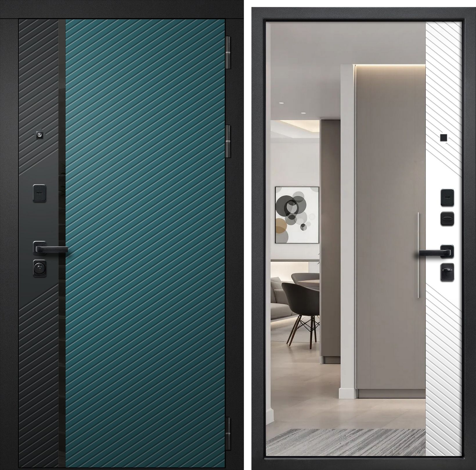 Представляем вашему вниманию стильную входную дверь от брендов "Сибирь Профиль" и "FLY DOORS"! Новинка сезона – покрытие из порошково-полимерного муара черного цвета (RAL 9005), утонченное сочетание МДФ-панели оттенка Velluto Verde и вставки черной шагрени. Внутри дверное полотно декорировано DWP+МДФ и зеркалом серии ФЛЗ-27 «ПАНОРАМА» белого тона (Velluto Bianco). Дверь комплектуется надежными замками серий Galeon и Galele, удобной ручкой модели FZ19-317 и защитной броненакладкой 16-7ZS17-Y. Приобретите сейчас и получите скидку 3% за честный отзыв!